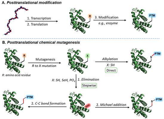 Abnormal posttranslational modification of proteins or misregulation of these marks is implicated in many human diseases. Access to homogeneously modified proteins with desired PTMs is critical to interpreting their molecular role and physiological outcome. Unfortunately, investigating a specific PTM poses many challenges. Many PTMs have been discovered at several positions, which could also appear in different combinations to “crosstalk” and yield a new complex phenotypic outcome. In nature, many PTMs are attached enzymatically to proteins in a very controlled manner (Figure 1A). However, in vitro enzymatic modification of isolated proteins is challenging, as it often results in a heterogeneous product due to insufficient specificity and a lack of control over the degree of modification. Other biological approaches, such as genetic code expansion technology, allow site-specific incorporation of unnatural amino acids into any protein of interest in cells using engineered orthogonal aminoacyl-tRNA synthetase/tRNA [5,6]. Importantly, this strategy has enabled selective insertion of several PTMs into recombinant proteins, including methylation, acetylation, nitration, and phosphorylation. Despite the enormous potential of this approach, this method relies on the availability of an orthogonal tRNA synthetase for desired modification, and it is difficult to apply for transferring multiple PTMs into the same protein [5,6].