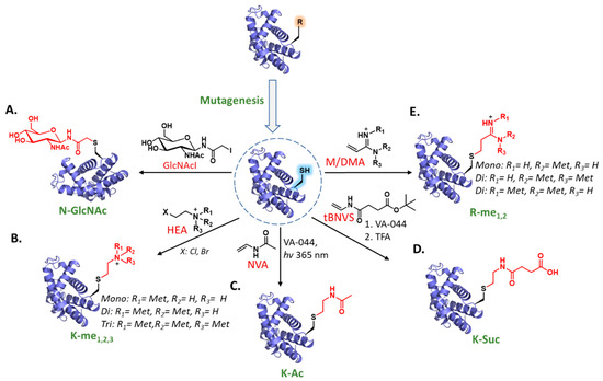 Late-stage conjugation strategies allow facile protein diversification by rapidly transferring an array of unique modifications into proteins [53]. The unique nucleophilic nature and low abundance of Cys compared to other residues enables facile protein functionalization with various PTMs in high homogeneity [54]. In this strategy, the protein of interest is recombinantly expressed with Cys mutation at the desired modification site to allow chemoselective transfer of electrophilic PTM precursors. These approaches enable direct protein functionalization with “small” PTMs such as mono-/di-/trimethylation [47], succinylation [55], glycosylation [46], acetylation [56] marks, and large complex analogs (e.g., ubiquitylation and sumoylation) [57].