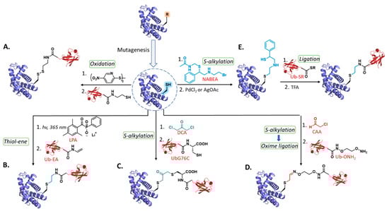 Chemical protein ubiquitylation. Chemoselective ubiquitylation: (A) oxidation; (b) thiol–ene addition; (C) S-alkylation; (D) S-alkylation coupled with oxime ligation; (E) S-alkylation coupled with NCL.