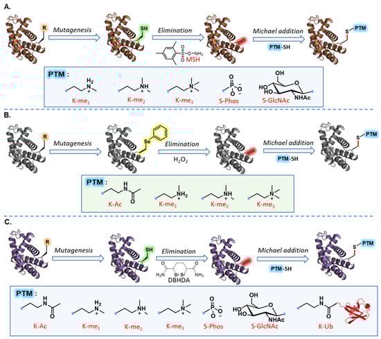 Several strategies have been developed to incorporate Dha into recombinant proteins under biocompatible conditions [71]. Davis and coworkers reported a facile conversion of Cys to Dha using a bis-alkylation reaction followed by thiol elimination under slightly alkaline conditions. The authors introduced the commercially available and water-soluble reagent 2,5-dibromohexanediamide (DBHDA) as an excellent reagent for Dha formation starting from engineered Cys residue (Figure 4C) [71]. The facile introduction of Dha into recombinant proteins and the unique electrophilicity of α,β-unsaturated carbonyl moiety enabled the transfer of numerous PTM mimics via Michael-type addition reactions with various nucleophiles. Chalker et al. demonstrated the potential of the Dha site to prepare synthetic histone proteins bearing diverse PTM mimics [73]. The authors mutated the desired modification site in histone H3 to Cys using site-directed mutagenesis and then converted it to Dha using DBHDA. The introduction of the electrophilic moiety enabled rapid and effective insertion of all three methylation states of Lys, acetylated Lys, phosphorylated, and glycosylated Ser mimics by adding the appropriate thiol (Figure 4C). Furthermore, the sequential formation of Dha and its conjugation with target PTM mimics have been successfully achieved in a simple one-pot operation to provide the final modified products in good yield.