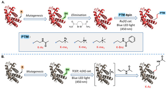 In 2020, Davis and coworkers introduced a robust alternative strategy to incorporate a range of challenging functional groups and PTMs into recombinant proteins through carbon–carbon bond formation using a single-electron transfer method (Figure 7A) [81]. The authors described a visible-light-driven installation of several natural and non-natural side-chains, as well as PTMs, at Dha-tagged proteins under mild conditions. The Dha-tagged proteins reacted in the presence of Ru(II) photocatalysts with blue LED light (450 nm) to enable carbon–carbon bond formation in high fidelity. Like the previous methods, the reaction was driven by radical generation from radical precursors such as boronic acid catechol ester or pyridylsulfonyl derivatives coupled with Fe(II). These conditions enabled the versatile transfer of a broad range of native and modified amino-acid side-chains (>50 unique analogs) into a set of recombinant proteins. Importantly, this approach allowed for the insertion of several PTM analogs into histone proteins with acetyl-, methyl-, and benzyl-Lys mimics to probe the interaction of posttranslational enzymes (e.g., readers and erasers) and modified histones.