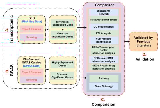 The development of T2D can be amplified by regular smoking, as well as many complications which can be developed in T2D patients with a smoking history. Hence, we have tried to retrieve common molecular mechanisms that exist between T2D and smokers. Molecular mechanisms and relationships underlying the T2D-smoker are yet unclear in medical endocrinology [], but they are still of significant interest. Moreover, there is still a lack of bioinformatics studies regarding the relationship between T2D and smoking. The goal of our study is to warn the active smokers that they can develop T2D and to help the drug developers so they will be able to eliminate the risk of many complications in T2D patients due to smoking. Therefore, this inspired us to apply a bioinformatics-based systemic pipeline to analyse the gene expression data of T2D patients and smokers to obtain an insightful understanding of their relationship. To comprehend molecular causes of biological disease and condition, differentially expressed genes (DEGs) [] should be identified for further system biology analysis. In this study, RNA-seq datasets [] (transcriptomic data []) were utilised to discover DEGs shared by T2D and smoker. We have used the DESeq2 package [] which is frequently used for differential gene expression analysis of RNA-seq count data. We identified commonly dysregulated genes, pathways and Gene Ontology (GO) protein–protein interaction (PPI) [], hub-proteins [], Transcription Factor Gene Interactions [], Gene miRNA Interaction [], Protein–Drug Interaction []; that are associated with T2D and smoker using a systems biology approach. Finally, we have analysed common genes, pathways and GO using GWAS datasets []; later, we discuss and compare with transcriptomic analysis. We have represented the methodology of our hypothesis as shown Figure 1.