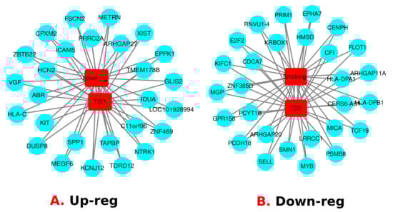 For TFs, protein–drug interactions, and gene–microRNA interactions, we have used Net-workAnalyst tools []. Transcription factors (TFs) are proteins that control gene expression in all living organisms. In every cell process, TFs perform a critical function []. Gene expression is regulated in the post-transcription stage by non-coding short RNA molecules called miRNAs. Protein–drug interaction studies are critical to understanding the structural characteristics required for ligand affinity [,]. The TFs-Gene network was constructed using the ChIP-X [] and JASPAR database []. The TarBase [] and miRTarBase database [] were utilized to develop Gene–miRNAs interaction network using NetworkAnalyst. Moreover, protein–drug interactions are constructed using the DrugBank database []. Figure 8 visually represents the TF–Gene Interactions, and the regulator genes are: ARHGAP27, E2F2, KIT, EPHA7, TAPBP, KIFC1, ARHGAP11A, SPI1, POU5F1, NANOG, SOX2, METRN, TCF19, SMN1, TDRD12, MGP, E2F1, GATA2, NFKB1, NFIC, SRF, YY1, TFAP2A, FOXL1, TP53, POU2F2, FOXC1, PRRC2A, VGF, CDCA7, SPP1, FLOT1, ABR and MYB. Figure 9 visually represents miRNA’s genes interactions that are: mir-146a- 5p, mir-34a-5p, mir-27a-3p, mir-129-2-3p, mir-124-3p, mir-193b-3p, let-7b- 5p, mir-26b-5p, mir-31-5p, mir-93-5p, mir-331-3p. Finally, Figure 10 visually represents the Protein–Drug Interactions for smoker and T2D complications and common genes are: KIT and NTRK1. The genes are related to drugs called Ponatinib, Dasatinib, Pazopanib, Sorafenib, ABT-869, OSI-930, MP470, XL184, XL820, Nilotinib, Phosphonotyrosine, Lenvatinib, Sunitinib, Imatinib, Regorafenib and Amitriptyline.
