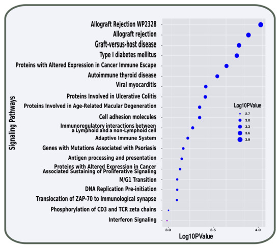 T2D development is significantly influenced by the MAPK signalling pathway [], where cigarette smoke particles may activate MAPK pathways []. The Allograft Rejection pathway is also activated in T2D patients [], where Allograft Rejection is more likely to active in people with a history of smoking cigarettes [,]. PI3K/AKT pathway damaged in various tissues of the body leads to the development of T2D as the result of insulin resistance [], and tobacco smoke exposure can activate PI3K/Akt pathway []. Endosomal/Vacuolar pathways is presented in T2D []. Hence, in vitro, researchers can work on this pathway to make resistance to T2D. Therefore, the continuous inactive stage of the Allograft Rejection pathways, PI3K/Akt pathway and MAPK pathway may be possible by quitting smoking at an early period or taking drugs to alter the current active status of the pathways in T2D patients. Ultimately, avoiding smoking is highly recommended for both control (absence of T2D) and T2D patients so that the pathways do not influence by smoking. As far as we know, no bioinformatics approach had previously described these pathways and to the best of my knowledge, other pathways identified in our study are not specified by any previous literature for developing T2D. Yet those pathways may be potential drug targets that paved the way for further research and analysis.