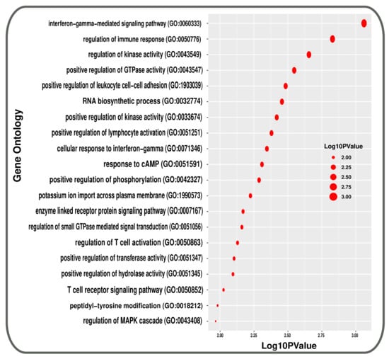 Top 20 Gene Ontologies represented using a bubble plot that are linked with both conditions in transcriptomic analysis.