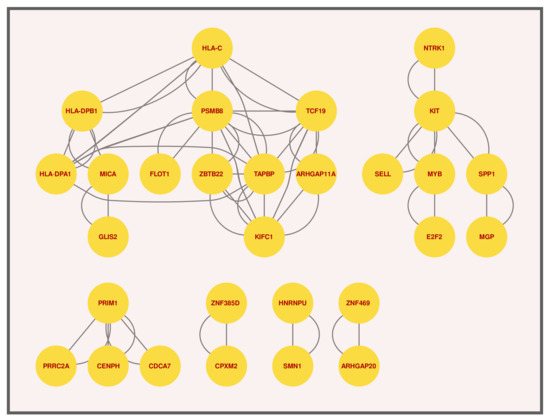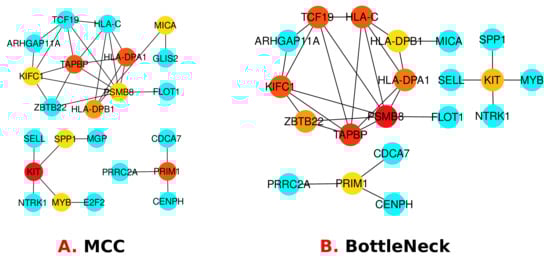 STRING [], a database, was handled to perform protein–protein interactions (PPI). In Cytoscape [], the PPI network has been processed and analysed. Based on proteins encoded by the common DEGs between T2D and Smoking, we developed a PPI network on the STRING. In Cytoscape, this is prepared and assessed, and the results are shown in Figure 6. Protein subnetworks that are shared by two or more diseases are known to be linked to each other. The highly interacting proteins were discovered by PPI analysis using topological characteristics, such as degree larger than 15°. The CytoHubba [], a plugin in Cytoscape, was installed and operate to find the highly linked hub proteins in the PPI network using degree and Maximal CliqueCentrality (MCC) and BottleNeck algorithm. These newly discovered hub proteins may be beneficial as therapeutic targets, but further study is needed to understand their functions. As mentioned earlier, hub proteins are identified using two algorithm named MCC and BottleNeck, and represented in Figure 7A,B. By using the MCC algorithm we have found a total of 23 hub proteins where the top 10 genes are highly significant marked as red, orange and yellow colors. In addition, by using the BottleNeck algorithm, we have found a total of 20 hub proteins where 10 are shown as the most significant (marked as yellow, red and orange colors). In both algorithms, we have found a total of 13 most significant hub proteins that are unique and they are: KIFC1, TAPBP, HLA-DPA1, HLA-DPB1, PSMB8, SPP1, KIT, MYB, MICA, PRIM1, TCF19, HLA-C and ZBTB22. Among them seven proteins are shared by both algorithms that are: KIFC1, TAPBP, HLA-C, HLA-DPB1, HLA-DPA1, KIT and PRIM1 as well as most significant.