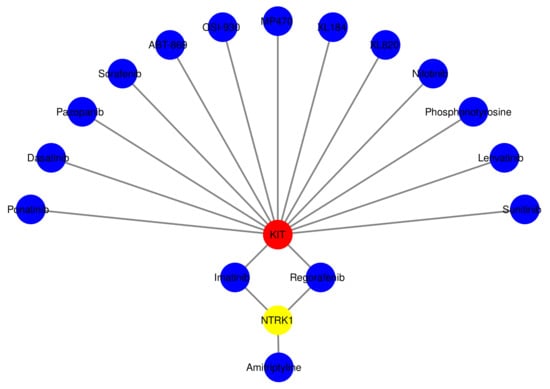 In protein–drug interactions, we have discovered two genes named KIT and NTRK1 that are connected to 16 drugs for T2D with a smoking history (shown in Figure 10). KDM6A binding to the NTRK1 promoter because of YY1 and subsequent TRKA overexpression led to imatinib resistance []. Moreover, it has been demonstrated that imatinib improves glycemic control in diabetics []. According to this information, imatinib is connected to the NTRK1 gene, and it helps to control T2D. Comorbid diabetes mellitus, IFG, or IGT can be treated with sorafenib, a safe and effective therapeutic option []. In addition, sorafenib inhibits the Imatinib-Resistant KIT. As well, stable Ba/F3 KIT mutants recapitulated the genotype of imatinib-resistant individuals with primary and secondary KIT mutations []. So, this sorafenib drug can resist T2D. It was found that sunitinib lowered insulin requirements []. In addition, tyrosine kinase inhibitors (TKIs), such as Sunitinib and other TKIs, have been demonstrated to lower blood glucose levels in T2D patients []. Sunitinib was administered to patients with KIT overexpression, and responses were evaluated using the Response Evaluation Criteria in Solid Tumors (RECIST) and those with KIT mutations are more responsive to Sunitinib. As well, sunitinib may be superior to other KIT inhibitors due to its ability to inhibit VEGFR1, VEGFR2, VEGFR3, and platelet-derived growth factor receptor (PDGFR) []. So, inhibiting mutant-like KIT in metastatic melanoma with nilotinib and dasatinib is becoming increasingly popular. Apart from binding and inhibiting ABL’s kinase domain, nilotinib affects KIT and PDGF receptor kinases more effectively than imatinib []. In an accelerated-phase, CML patient with T2D, dasatinib reduced hyperglycemia rapidly []. The resulted drug is found from a shared analysis of T2D and smoking. Although the drug is only validated for T2D as per previous literature, it may also mediate the negative consequence that occurred from smoking. Therefore, our predicted drug may be well performed for T2D with a smoking history.