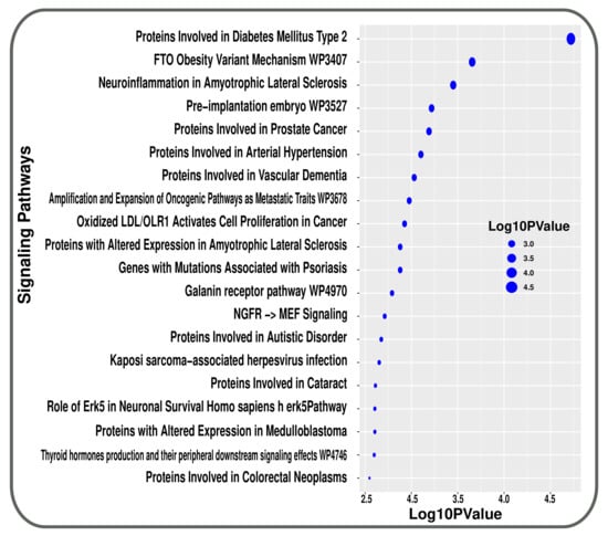 In pathway analysis, we have used five different databases named BioCarta, Elsevier Pathway, KEEG, Reactome and WikiPathway. Then, we have looked for highly expressed pathways by utilizing shared DEGs between T2D and smoking. These pathways were then divided into functional groups for analysis. Initially, we got 573 signalling pathways linked with both disease and condition. Manual curation was then utilised to abate the number of pathways. Pathways with p-values below 0.05 are considered. Therefore, we got 169 most significant signalling pathways. Finally, we sorted the pathways in ascending order depending on p-value. The top 20 pathways were represented in Figure 4 that were linked to T2D and smoking condition.