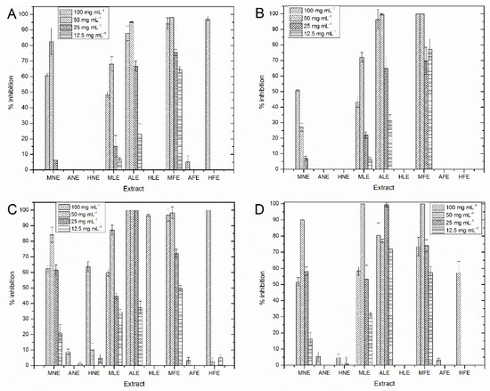 Inhibition percentage of the extracts at different concentrations against (A) V. parahaemolyticus; (B) V. harveyi; (C) P. damselae; (D) P. leiognathi.