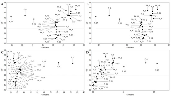 Figure 2 shows PLS-DA plots constructed with polyphenol profile of extracts and inhibition percentage. The preceding is in order to identify the bioactive compounds associated with the inhibition of the different bacteria evaluated. Those compounds with VIP > 0.8 and coefficient values > 0 can be considered responsible for the extracts’ inhibitory activity. Likewise, compounds with VIP > 0.8 and coefficient values < 0 can be regarded as growth stimulators.
