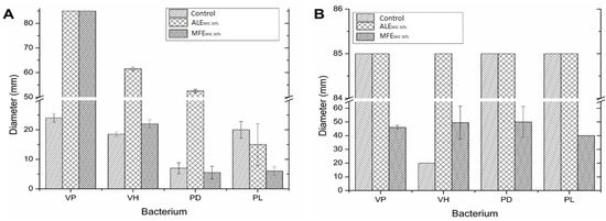 Both extracts (ALE and MFE) increased the swarming motility of V. parahaemolyticus, V. harveyi, and P. damselae, and swimming motility to V. harveyi. Increased motility in bacteria (chemotaxis) could respond to avoiding contact with the antimicrobial compounds present in the extracts [42]. On the other hand, P. leignathi decreased its swarming motility in the presence of ALE and MFE, as well as V. parahaemolyticus, P. damselae, and P. laiognathi decreasing their swimming motility in the presence of MFE at sublethal doses. One of the responsible compounds for this phenomenon could be naringin, which was reported as an inhibitor of swimming and swarming motility in Chromobacterium violaceum and Yersinia enterocolitica [32,34]. This could be due to the inhibition of the microorganisms in question or directly affected by the bacteria flagella [42].