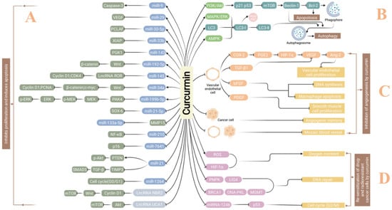 Part A: Curcumin inhibits proliferation and induces apoptosis of cancer cells through miRNA and lncRNA-mediated mechanisms. Part B: Curcumin-mediated autophagy of cancer cells. Curcumin may inhibit the PI3K/Akt signaling pathway to activate the autophagy marker Beclin-1, which induces apoptosis via inhibition of Bcl-2 and promotes the formation of autophagosomes from the free phagophores, inducing autophagy. Curcumin can also activate the MAPK/ERK and AMPK signaling pathways or LC3 to induce autophagy via an LC3-II-mediated mechanism. Part C: Inhibition of angiogenesis by curcumin. Curcumin can inhibit the proliferation of vascular endothelial cells and smooth muscle cells through COX-2/PGE2, TGF-β1-, bFGF- and PDGF-mediated mechanisms. Curcumin can also inhibit the angiogenic mimicry of cancer cells and mosaic blood vessel formation in co-cultures of cancer cells and vascular endothelial cells. Part D: Re-sensitization of radioresistant cancer cells by curcumin. Curcumin can increase oxygen content through upregulation of ROS or downregulation of HIF-1α, inhibit DNA repair and promote cancer cell arrest at G2/M through the miRNA-1246-mediated p53 pathway.