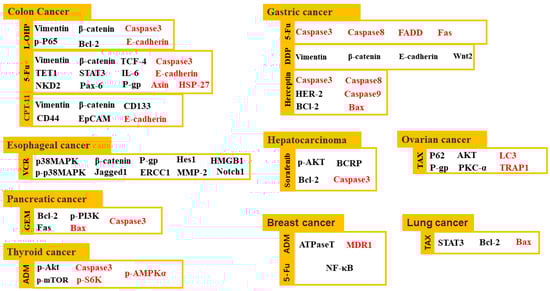 In addition, curcumin can reverse the resistance of colon cancer cells to oxaliplatin [68], irinotecan [69], 5-Fu [70], doxorubicin [71], capecitabine and taxol [72], liver cancer to sorafenib [73], gastric cancer to trastuzumab [74] and 5-Fu [75], esophageal cancer to vincristine [76], pancreatic cancer to gemcitabine [77], breast cancer [78] and thyroid cancer [79] to doxorubicin, and lung cancer to paclitaxel [80]. Curcumin inhibits the proliferation, invasion and metastasis of these drug-resistant cell lines and promotes their apoptosis through a wide range of targets. Figure 2 partly demonstrates the effective mechanisms by which curcumin resensitizes drug-resistant cancer cells.