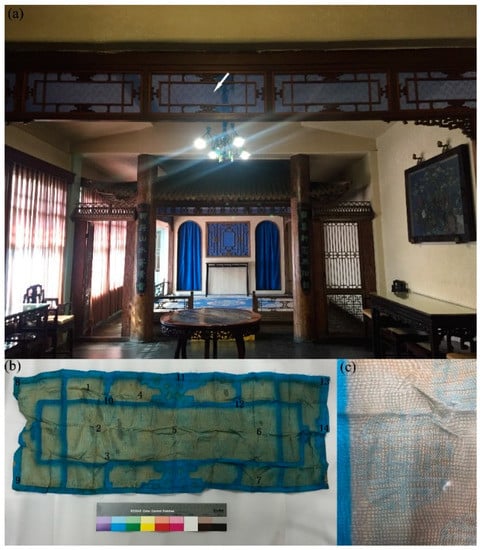 The Studio of Cleansing Fragrance was constructed in 1420 as a maid’s residence during the Ming Dynasty (1420–1644), as a prince’s residence during the early Qing Dynasty (1644–1736), and underwent extensive restoration by the Qianlong Emperor (1736–1795). However, according to the synthesis time of malachite green, the marquisette curtains dyed by MG were applied as panel curtains at least after 1878. The curtains were decorated as historical interiors and illuminated with sunlight; they were detached in 2015 for the reparation of the building, and thus their service time was more than 100 years. The Studio of Cleansing Fragrance is an H-shaped hall and consists of front and rear courtyards that are connected with corridors. The smaller stage located in the western bay of the rear hall is used as a tea banquet for the emperor and civil officials on a chosen auspicious day during the Qianlong Emperor’s reign. The photograph of the curtain (95 cm × 36 cm, Figure 1a) showed its original location, which was in the north and south positions of the smaller stage, and it was removed for hanging new ones for visits and receptions. Yu always found this kind of marquisette curtain, which was made of a single layer with a common structure, in ancient Chinese buildings of “wooden frame-curtain-wooden frame” in the Hall of Mental Cultivation [20]. Due to the long-term effects of sunlight, most of the parts that were exposed to the air had obviously faded, and little parts blocked by the wooden window still kept their original lake blue color (Figure 1b). A circle tuanshou pattern filled with two symmetric swastikas as a characteristic unit was woven over the whole fabric (Figure 1c). As a traditional Chinese ornament meaning auspiciousness and longevity, it is commonly found on brocades, hollow doors, and windows in the Ming and Qing Dynasties.