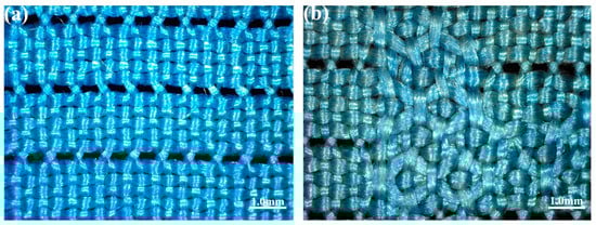Figure 2. The observation of the plain weave structure of the marquisette curtain (a) ×50; (b) ×50.