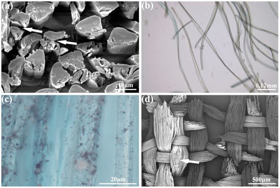 Figure 3. The fiber microphotographs under the SEM (a) ×2000; (d) ×50 and stereomicroscope (b) ×400; (c) ×4200, respectively (arrows show the damage, cracks, and fractures of the silk).