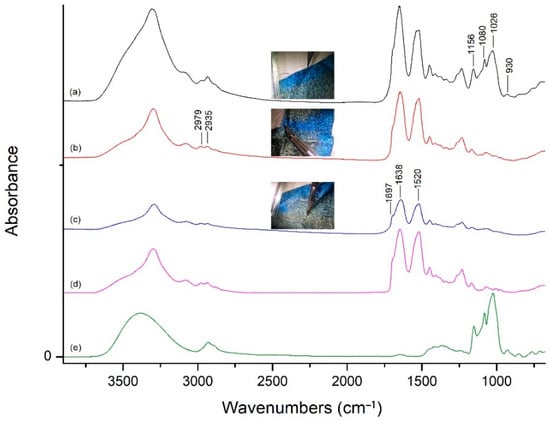 Figure 4. FTIR spectra of the curtain fabric: (a) unfaded outer border with adhesive; (b) unfaded inner edge without adhesive; (c) faded textile; and standard spectra of native mulberry silk (d) and starch (e).