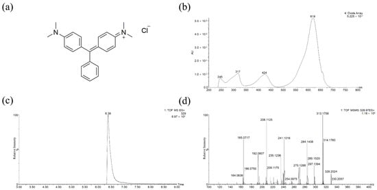 Figure 5. MG chromatogram and spectra: (a) molecular structure; (b) UV–visible absorption spectrum; (c) extracted ion chromatogram (EIC); and (d) MSMS spectrum with pseudo-molecular ion m/z 329 in a positive ion mode.