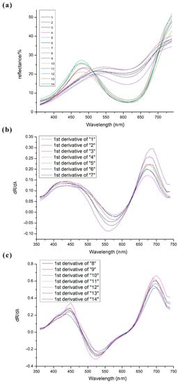 Figure 6. Reflectance spectra of the curtain relics: (a) raw spectra of no. 1–14; first derivative curves of (b) no. 1–7 and (c) no. 8–14 (no. represents the marked numbers).