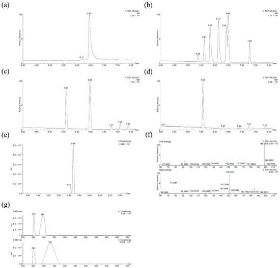 Figure 7. MG representative chromatograms by UPLC-ESI-QTOF MS in a positive ion mode under different aging time: (a) K0, 0 h; (b) K26, 72 h; (c) K27, 78.5 h; (d) K28, 96 h; (e) co-elute liquid chromatogram; (f) MS spectra with an MSE of low and high energy under an RT of 5.56 min; and (g) UV–Vis absorbance spectra under an RT of 5.43 and 5.48 min (offset 0.08).