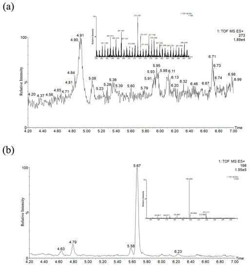 Ultra-high-performance liquid chromatography coupled with quadrupole/time-of-flight mass spectrometry (UPLC-QTOF MS) was equipped with two detection sets of chromatographic separation and mass spectrometry systems, including Waters ACQUITY H-Class UPLC with a PDA detector and Waters Xevo G2-XS Q-TOF MS with an electrospray ionization (ESI) ion source. The analytical conditions were as follows: The separations were carried out on ethylene bridged hybrid (BEH) C18 column (2.1 × 100 mm, 1.7 μm); the temperature was set at 30 °C. The UV detective wavelength ranged from 190 to 800 nm. The flow rate was 0.3 mL/min. The mobile phase was composed of water containing 0.1% formic acid as solvent A and acetonitrile as solvent B. The gradient was 95% A from 0 to 0.3 min, 95–5% A from 0.3 to 9.3 min, 5% A held for 1 min, then 5–95% A from 10.3 to 10.5 min and held at 95% A for 1.5 min. Instrument control and data acquisition were performed using MassLynx V4.1 software. Data processing was conducted using the UNIFI 1.9.3, MSE technique with all of the data all the time and the MSMS method in sensitivity mode. The scan range was from 50 to 1200 m/z. Other conditions were optimized as follows: source temperature, 120 °C; cone voltage, 40 V; capillary voltage, 3 kV; desolvation gas (N2) flow rate, 600 L/h; nebulize gas flow rate, 10 L/h; desolvation temperature, 450 °C; and collision energy, ramp high energy from 20 to 45 eV. Real-time calibration (every 30 s) applied leucine enkephalin (0.4 ng/μL) as an internal standard.