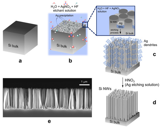 Scheme for the realization of vertical arrays of Si nanowires by Ag-mediated metal-assisted chemical etching. (a) The Si wafer was first treated for the removal of the native oxide and then (b) etched in an AgNO3/HF solution as described in the Materials and Methods section. (c) As shown in the inset of (b), during the etching (c) the formation of Ag dendrites occurred as a byproduct of the rection, (d) which were subsequentially removed by etching in an HNO3 solution. (e) Cross-section scanning electron microscopy of the used 2 µm long Si NW array.