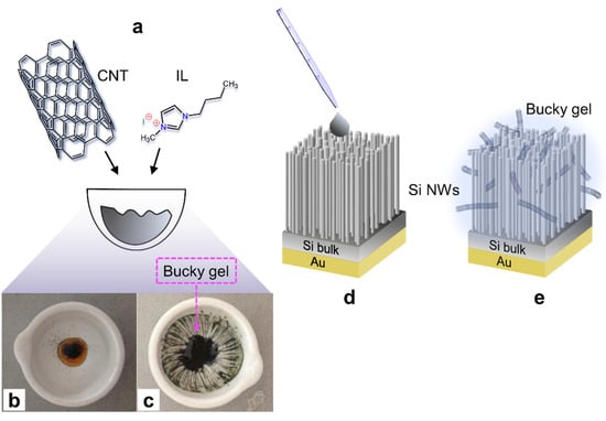 A schematic illustration of the manufacturing steps of the coaxial device of p-doped Si NWs (100) coated with the IL-CNT bucky gel is shown in Figure 2.