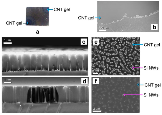 The evolution of the infiltration process in the dense network of NWs was monitored by SEM analysis, verifying that the NWs were completely incorporated into the CNT bucky gel for all the adopted ionic liquids. Once prepared, the CNT bucky was deposited onto the two opposite corners of the NW sample as shown in the photo in Figure 3a. The presence of the spotted CNT gel was clearly visible and highlighted with the light blue arrows onto the NWs sample with a dimension of 1 × 1 cm2. The applied gel quickly diffused from the opposite corners across the NWs network, wrapping them completely. As a confirmation of the improved absorption of Si NWs, it is worth noticing the black appearance of the Si NWs corresponding to a reduced reflectance below the value of 10% in the visible range. The diffusion process was analyzed by SEM, and the evolution of the drop was observed at different time intervals. At the top of Figure 3b, it is possible to see the edge front of the bucky gel diffusing across the NWs. In the lower part of the SEM image, the NWs appeared as a series of brighter points not yet covered by the gel. The interface region was also brighter, showing the CNTs crowding at the drop front as it diffused. The NWs behaved similar to a sponge; in fact, the gel spread from the sides towards the center until it completely covered and incorporated the NWs. The gel diffusion was investigated both in cross-sections and (Figure 3c,d) and plan views (Figure 3e,f) right after its application, as shown in Figure 3c,e, and then after 10 min (Figure 3d,f). Further proof of the realization of the core-shell structure consisting of NWs incorporated in the IL-CNT gel is reported in Figure 3c showing the SEM cross-section after its infiltration. In Figure 3c we can clearly observe the gel completely wrapping the NWs, whose length is barely visible. After 10 min of e-beam exposure, the gel diffused laterally leaving a hole in the gel matrix that showed without any ambiguity the presence of NWs (Figure 3d). We also observed that the hole could be refilled with the gel after a few minutes after the beam exposure. As shown in the previous SEM image, the NWs immersed in the gel were barely visible when not subjected to the beam focalized exposure. The comparison of the beam exposed area with the neighboring unexposed regions demonstrates the complete coating of the NWs in the CNT gel. In Figure 3e,f, it is possible to see the SEM plan-view images acquired at the same point after 10 min. At the beginning of the gel diffusion, the contours of the NWs appeared broadened and blurred due to the presence of the gel (Figure 3e). Repeating the SEM scan in the same point of Figure 2e after about 10 min, it is visible that the tips of the NWs were completely covered by the gel (Figure 3f). By comparing the two plan views, it can be seen that the gel diffused rapidly from the sample edges towards the center, diffusing across the NW holes from the bottom first and then wrapping upwards onto the tips until their complete incorporation into the CNT gel.