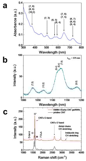 (a) UV-VIS absorption spectrum and (b) room temperature photoluminescence at 375 nm excitation spectra of the BMIM-I CNT Bucky gel with a concentration of 5.7 mg/mL. (c) Raman spectra of pristine CNT enriched in chirality (7,6) in black and the hybrid platform of CNT bucky BMIM-I gel applied onto the NWs in red, reported in the 1000–4000 cm−1 window of interest for the organic C-based bonds. The upper inset shows the SEM image of the NWs covered with the CNT gel.