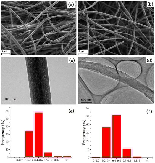 SEM images, TEM images, and the diameter distributions of the nanofibers: (a,c,e) polystyrene (PS) nanofibers and (b,d,f) polystyrene/polypyrrole (PS/PPY) nanofibers.