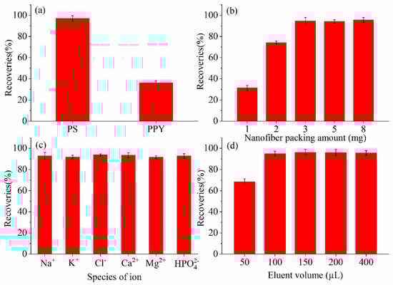 PFSPE condition optimization: (a) species of nanofiber; (b) ion species; (c) species of ion; and (d) volume of eluent; error bar = SD (n = 3).