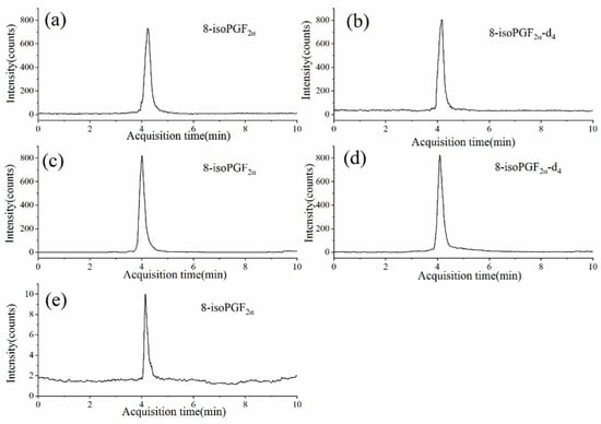 Chromatograms of (a) 8-iso-PGF2α, (b) 8-iso-PGF2α-d4 in real urine sample after PFSPE; (c) 8-iso-PGF2α (0.2 ng/mL), (d) 8-iso-PGF2α-d4 (0.2 ng/mL) in a standard solution with PFSPE; and (e) urine sample without PFSPE.