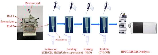 The SPE column was prepared by packing and compacting 3.0 mg of PS-electrospun nanofibers into the column tip (1.5 mm diameter) with a fine steel rod (0.5 mm diameter). The column was preconditioned with 100 µL of methanol and 100 µL of water, respectively. Freshly thawed urine was centrifuged at 12,000 r/min for 3 min. An aliquot of 1000 μL supernatant was mixed with 20 μL of working 8-iso-PGF2α-d4 solution by a vortex mixer for 30 s. Then, the mixture was loaded into the SPE column. As shown in Figure 4, a self-made semi-automatic array SPE processor, which can simultaneously pretreat 12 samples with 12 SPE columns, was used. An enlarged view of the device can be found in Supplementary Figure S1 of Zhao’s article [28]. The pressurizers converted from syringes were installed in the upper plate and the SPE columns were installed in the lower plate. The lower plate can be moved and fixed by operating Rod 1 and Rod 2 at the same time. Air pressure was provided by rotating the pressure rod to drive the push rod of the pressurizer, controlling the solution to pass through the column at a rate of 5 s per drop. The column was rinsed with 100 µL of water for 3 repetitions. Finally, the column was eluted with 100 µL of methanol, and 20 µL of the eluent was injected for detection immediately.