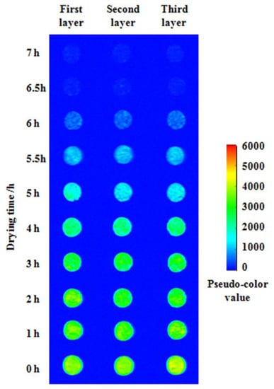 | Drying Time/h | Measured Moisture Content/(g/g, w.b.) | T2 Relaxation Signal | Hydrogen Proton Imaging | ||||