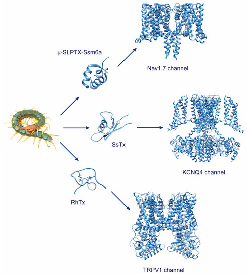 Extensive research on the pharmacological properties is ongoing, and several of these venom-derived components are under clinical trials as potential therapeutic agents for several clinical indications. Currently, six FDA-approved venom-derived drugs are available on the market [110]. Pain is the most common presenting physical symptom and the primary reason for seeking medical care, which chronically affects people’s mental health and social life. As we know, NaV1.7 channels are promising analgesic targets for treating various pain-related diseases. The authors of this paper and other collaborators found a potent and selective inhibitor of the NaV1.7 channel, which exhibited a more potent analgesic than morphine in formalin-induced pain models. Thus, μ-SPTX-Ssm6a is a promising lead molecule for analgesic drug development. In addition, NaV channels are well-established therapeutic targets, such as local anesthetics, antiarrhythmics, and anticonvulsants. Therefore, centipede venoms are potential therapeutics for related diseases. Likewise, KV and CaV channels are potential therapeutic targets, including episodic ataxia, long-QT syndrome, epilepsy, benign familial neonatal convulsions, autosomal dominant non-syndromic hearing loss, hypokalemic periodic paralysis, night blindness, familial hemiplegic migraine and malignant hyperthermia [111]. Since the TRPV1 channel is widely distributed in the somatosensory system, the TRPV1 channel modulators, such as RhTx and RhTx2, can potentially treat pain and itch pathological conditions.