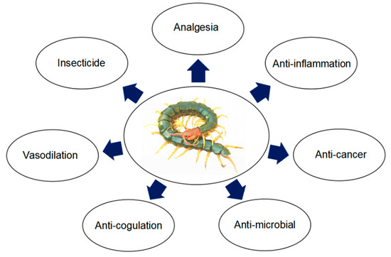 Animal venoms are abundant sources of bioactive peptides and proteins, which are used for the medical treatment of a broad range of diseases, including asthma, hypertension, cancer, cardiac failure, and polio [119,120,121]. Several venom-derived peptides from venomous animals have been clinically applied in cardiovascular, neurological disorders, and immune system diseases, such as captopril, ziconotide, tozuleristide, eptifibatide [119,122,123,124]. Despite the remarkable diversity of venomous animals, there appears to be a striking convergence regarding the types of proteins used in toxin scaffolds [37]. Nevertheless, our understanding of this fascinating area of evolution is limited by the small taxonomic range studied, with entire families of venomous animals almost entirely unknown. As an example, centipedes, class Chilopoda, may represent the oldest terrestrial venomous lineage after scorpions, having emerged approximately 440 Ma ago. Although the bioactive peptides and proteins from centipedes have not been fully appreciated and extensively studied, a prominent common attribute with most scorpion venoms, which is a well-studied group, is the presence of disulfide-rich peptides that act on the nervous system, cardiovascular system, musculoskeletal system and blood system. In addition, there are other differences in details. For instance, while both venoms contain neurotoxins that potently inhibit sodium channels, scorpion α-toxins specifically inhibit the fast inactivation mechanism of voltage-gated sodium channels leading to several neuro- and cardiotoxic effects.