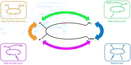The ongoing research on new drug discovery and development against cancers has brought forward the potential of cyclic peptides as anticancer agents. Cyclic peptides, which are a type of polypeptide chain compound, contain a circular (cyclic) sequence of bonds (Figure 1) and they have been recognized for their medicinal properties [5,6,7]. The utilization of cyclic peptides as pharmaceuticals offers advantages because they have good binding affinity, target selectivity, and low toxicity, making them an attractive treatment modality [8]. In addition, cyclic peptides are not easily recognized by protease enzymes; thus, they have better stability than their linear counterpart [9], and they are also suitable to be used against extracellular targets [10]. Although some peptides are available from natural sources, most of the known peptides are encrypted in the structure of parent proteins and are mainly released via enzymatic processes [11].