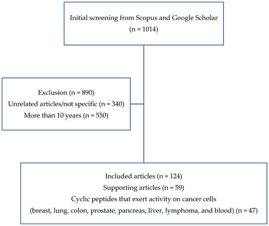 The inclusion criteria were as follows: (1) research articles, (2) cancer research, and (3) papers that described the utilization of cyclic peptides. Meanwhile, the exclusion criterion was articles that were published more than 25 years ago (before 1995). In the first stage of article collection, 1014 journal articles met the outlined criteria. However, after further examination, only 124 journal articles were chosen to be used for this review, which consisted of 75 articles on cyclic peptides with anticancer activity and 49 additional articles related to the mechanism and further supporting details. The article search flow is illustrated in Figure 2.