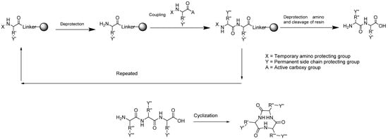 Strategies for the synthesis of cyclic peptide compounds often combine solid phase peptide synthesis and liquid phase peptide synthesis (Figure 3). In solid phase peptide synthesis, the strategy involves the selection of suitable resin, protective groups, and coupling reagents, whereas in liquid phase, it is necessary to select the cyclization center and coupling reagents. The solid phase approach has advantages of rapid product recovery, no repetition required, and simple product purification. However, this method is only suitable for small-scale production. The liquid phase approach, on the other hand, requires less reagent as compared with the solid phase strategy and produces good product yield, but a further purification process will be necessary. A combination approach is hence the best option to optimize product yield and purity [68,69].
