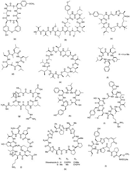 Structure of (a) RA-V; (b) Coibamide A; (c) Apratoxin A; (d) Galaxamide; (e) Bacillistatin 2; (f) Sansalvamide A; (g) Cyclosaplin; (h) Cyclo-CLLFVY; (i) Cyclo-SGWTVVRMY; (j) AFPep; (k) Wewakazole; and (l) Scleritodermin A.