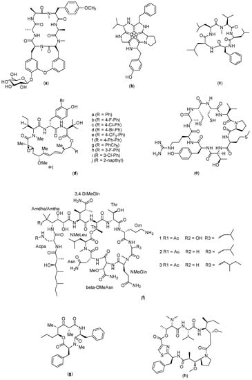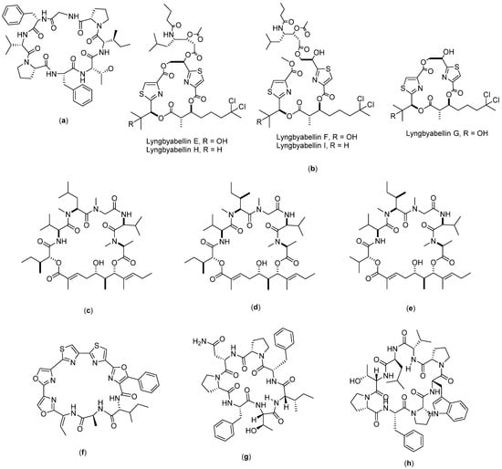 Structure of: (a) RA-XII; (b) Longicalcynin A; (c) Sansalvamide G; (d) Nannocystin (e) C25; (f) Theopapuamide; (g) Stereocalpin; and (h) Dol-10 cyclic.