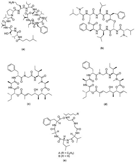 Structure of: (a) Kahalalide F; (b) IB-01212; (c) Lagunamides A; (d) Lagunamides B; and (e) Scopularides.