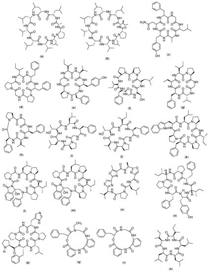 Structure of (a) Grifficyclocin B; (b) GG-8-6; (c) Dianthin A; (d) Dianthin B; (e) Dianthin C; (f) Dianthin D (g) Dianthin E; (h) Dianthin F; (i) Dianthin G; (j) Dianthin H; (k) Phakillestatin 6; (l) Analogs phakellistatin 6 (DLD-S); (m) Analogs phakellistatin 6 (LLD-S); (n) Leucamide; (o) Stylissatin A; (p) Stylissatin B; (q) Clavatustide A; (r) Clavatustide B; and (s) Clavatustide C.