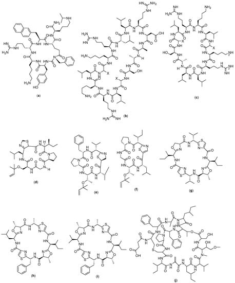 Bacillistatin 2 (Figure 4e) is a series of synthetic cyclic peptides reported to have anticancer activity. In a related study, 35 analogues were synthesized and tested against breast cancer cells, from which 14 showed sufficient activity against the cells [29].