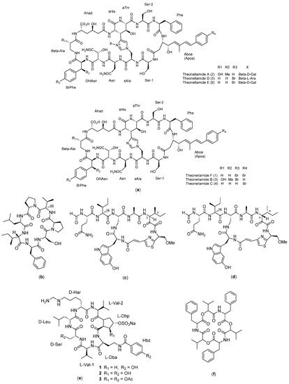 Theopapuamide (Figure 6f) is a compound isolated from the sea sponge Siliquariaspongia mirabilis. Theopapuamides A–D are undecapeptide compounds with an N-terminal fatty acid moiety containing two previously unreported amino acids, 3-acetamido-2-aminopropanoic acid and 4-amino-2,3-dihydroxy-5-methylhexano. Theopapuamide A–C compounds are known to exert cytotoxic activity on human colon cancer cells (HCT-16) with IC50 values between 2.1 and 4.0 µg/mL. In addition, this compound showed strong antifungal activity against wild-type and amphotericin-B-resistant Candida albicans strains at a load of 1−5 g/disk [45].