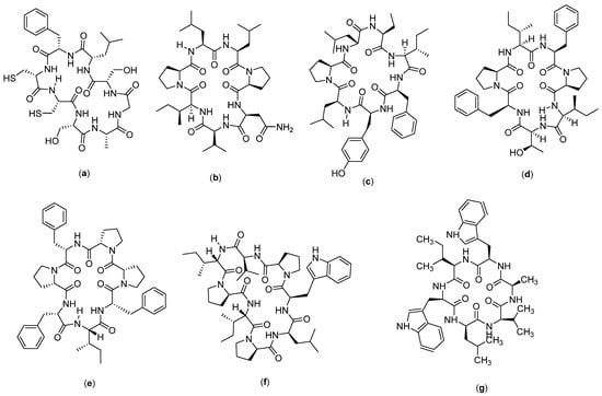 Stereocalpin (Figure 6g) is a cyclic depsipeptic obtained from the isolation of dry moss Ramalina terebrata with a structure consisting of cyclo-[Phe-N (Me) Phe-Unk]. Its cytotoxicity has been evaluated against several cancer cell lines, namely, the human colon carcinoma cell line (HT29), human skin carcinoma cell line (B16F10), and human liver carcinoma cell line (HepG2), which yielded IC50 values of 6.5 µM, 11.9 µM, and 13.4 µM, respectively. The mechanism of action has not yet been explored in depth, which is partly due to the lack of samples available for testing [46].