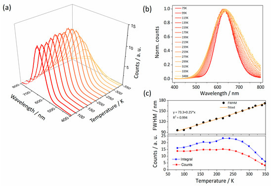 Upon heating the sample at low temperature, the cluster of [bppmCu2I2]2 exhibits a thermally stable emission, with slight emission variation up to a temperature of 239 K, and the PL decreases upon further warming (Figure 2a). It can be seen from Figure 2b that the FWHM of the complex evidenced significant broadening as the temperature rise. Temperature dependence of FWHM of the emission peak is shown in Figure 2c (top), which indicates that the broadband red emission from [bppmCu2I2]2 likely originates from distorted excited states (ES) due to the weakening Cu–Cu interactions at high temperature. The temperature dependence of the FWHM is well approximately fitted with a linear equation, and the PL emission increases with decreasing temperature and reaches its plateau at 239 K [51,52] (Figure 2c (below)).