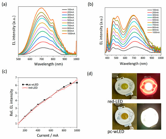 Initially, we investigated the high-power electroluminescence (EL) performance of [bppmCu2I2]2 phosphor with UV-LED chips (λmax = 365 nm). The results for the single-component red emission are shown in Figure 4a. The EL intensities of the red-emitting [bppmCu2I2]2 phosphor increase as the current increases from 100 to 1000 mA (Figure 4a) [54,55]. According to the Commission Internationale d’Eclairage (CIE) chromaticity diagram, the corresponding CIE coordinates slightly change from (0.59, 0.31) at 100 mA to (0.55, 0.34) at 1000 mA, which is close to a standard red emitter with the CIE coordinates of (0.66, 0.33) (SI, Table S3).