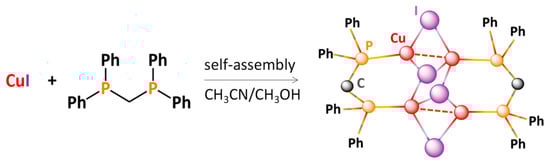 A Bruker APEX-2 CCD with graphite-monochromated MoKα radiation (λ = 0.71073 Å) was used for collecting the diffraction intensity data of [bppmCu2I2]2 at 100 K. The Bruker Instrument Service v4.2.2 and SAINTV 8.34A software were used to perform data collection, data reduction, and cell refinement [63,64]. The structural analyses were performed with direct methods through the SHELXS program, and the full-matrix least-squares routine was used for refinement with SHELXL based on F2 [65]. Multiscan program SADABS software was available to perform absorption corrections [66]. The C, P, Cu, and I atoms were anisotropically refined with the SHELXTL program package, and hydrogen atoms on organic ligands were geometrically generated by the riding mode [67,68].