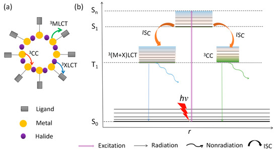 (a) Schematic structure and excited-state transitions of metal–halide clusters. M is metal; L is ligand; X is halide. (b) Excited-state decay pathways of Cu–halide clusters. 3(M+X)LCT, mixed metal– and halide–ligand charger transfer transition; 3CC, cluster-centered; ISC, intersystem crossing; Superscript‘3‘refers to triplet excited state.